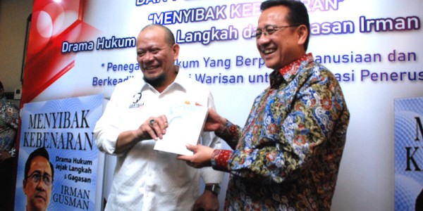 Telusur.co.id -Ketua DPD RI, La Nyalla Mahmud Mattalitti (kiri) menerima Buku dari Penulis dan Mantan Ketua