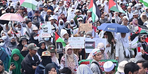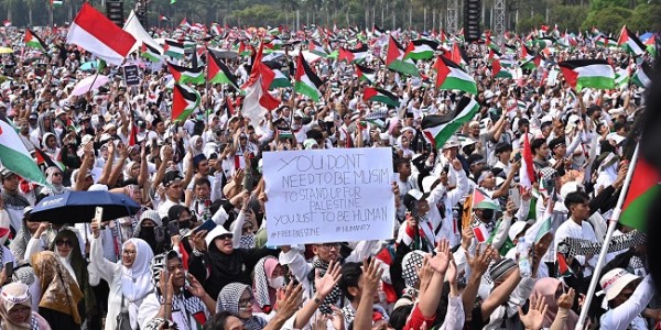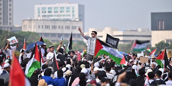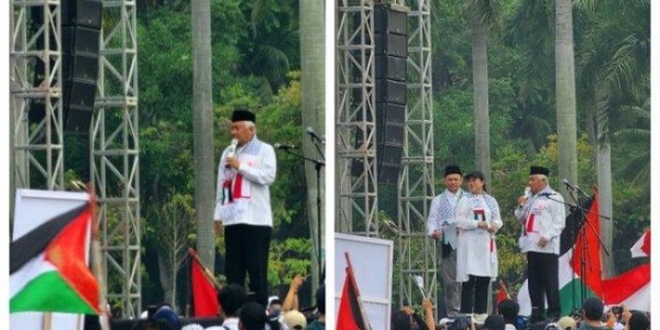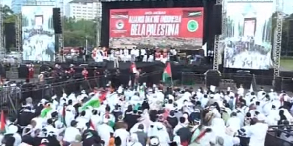 Telusur.co.id - Aliansi Rakyat Indonesia Bela Palestina yang menggelar aksi di Monas, Jakarta Pusat, Minggu (5/11/23)