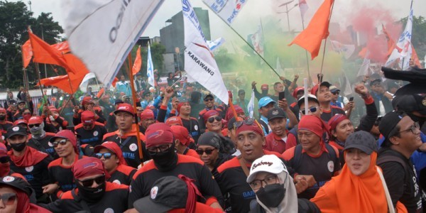 Telusur.co.id - Ratusan buruh yang tergabung dalam Partai Buruh dan Konfederasi Serikat Pekerja Indonesia (KSPI) menggelar
