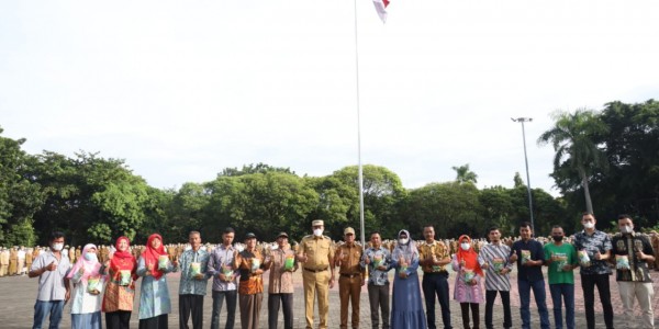 Telusur.co.id - Pelaksana tugas (Plt) Wali Kota Bekasi, Tri Adhianto memberikan benih kangkung kepada kelompok tani