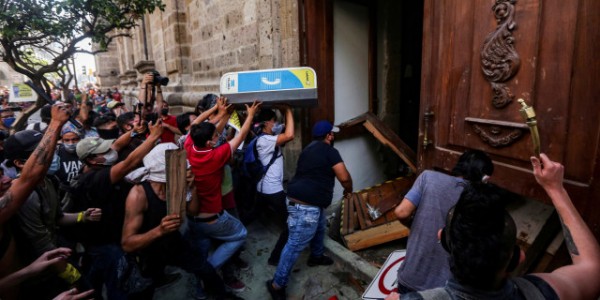Telusur.co.id - Para pria dan wanita bermasker yang memprotes kekerasan yang dilakukan polisi, merusak gedung-gedung dan