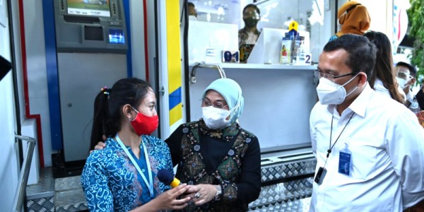 Telusur.co.id -Direktur Utama Bank BTN Haru Koesmahargyo bersama Menteri Ketenagakerjaan Ida Fauziyah berbincang dengan pekerja usai